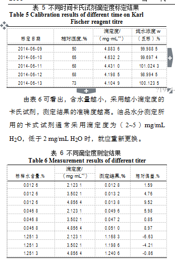 由表 5 可以看出,隨著時(shí)間的推移,卡氏試劑滴定度下降,是因?yàn)榭ㄊ显噭┦芸諝庵兴挠绊懀礈y(cè)試環(huán)境的濕度的增大。由于卡式試劑穩(wěn)定性隨時(shí)間不斷變化,所以測(cè)定新樣品時(shí),需要重新標(biāo)定滴定度,并用卡氏試劑循環(huán)沖洗滴定管。