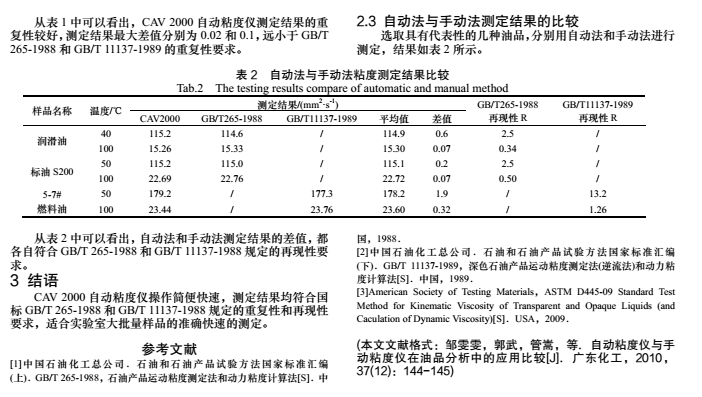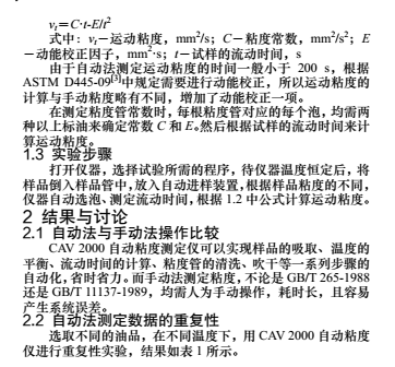 粘度是評定油品流動性的指標,是油品特別是潤滑油質量 標準中的重要項目之一。在油品流動及輸送過程中,粘度對流 量、壓降等參數起重要作用,因此又是工藝計算過程中不可缺 少的物理參數。目前G標中運動粘度的測定采用的方法是 GB/T 265-1988[1](石油產品運動粘度測定法和動力粘度計算法) 和 GB/T11137-1989[2](深色石油產品運動粘度測定法(逆流法) 和動力粘度計算法),均采用手動法進行測定,取樣及清洗工 作復雜,測定時間較長,不適合大批量樣品的準確快速的測定。 而美G CANNON 公司生產的 CAV 2000 自動粘度儀操作簡便、 快速,測定結果精度高,用于實驗室檢測能極大提高檢測效率 和檢測的準確度。                   1 實驗部分                   1.1 儀器                                       CAV 2000 自動粘度儀是一種具有寬粘度測量范圍的粘度 測量儀器,粘度范圍為:0.5~5000 cst/40 ℃,0.5~2000 cst/100 ℃,適用于透明及不透明液體運動粘度的測定,包括原油、輕 重質燃料油、潤滑油、柴油、添加劑、廢油等,能夠自行選擇 毛細管的測量范圍,恒溫浴溫度范圍為:20~150 ℃,并配有 雙溶劑清洗系統和烘干功能,能夠一次進樣 26 個樣品進行連 續測定。                         1.2 工作原理                   在 CAV 2000 自動粘度測定中,運動粘度的計算基于以下 公式:
